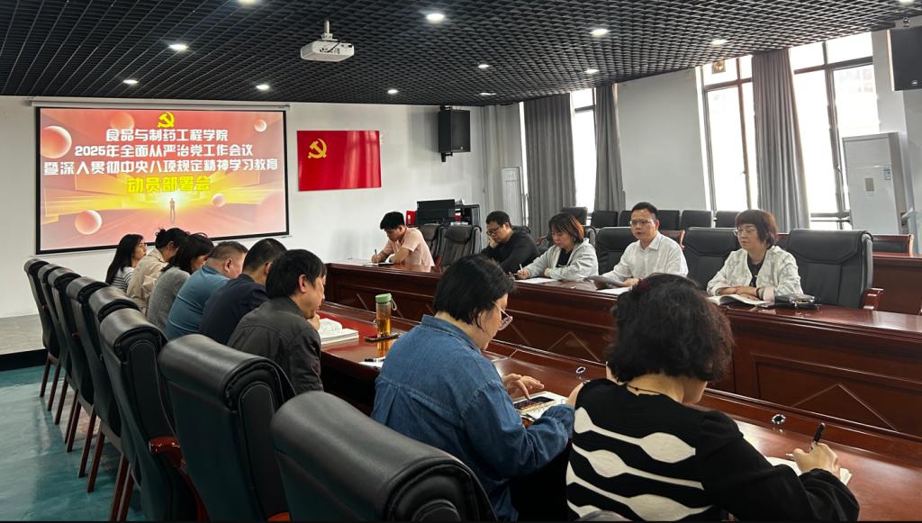 近期,食品与制药工程学院在学院大会议室召开2025年全面从严治党工作会议暨深入贯彻中央八项规定精神学习教育动员部署会。学院全体领导、党委委员、纪委委员、科级干部、各党支部书记以及教研室主任等参加了此次会议。
