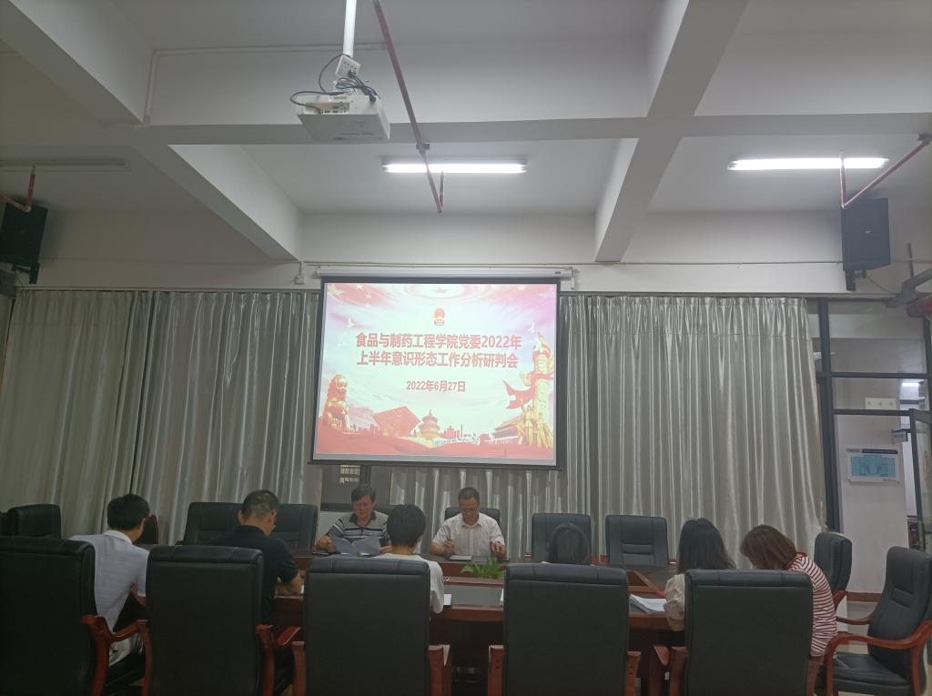 2022年6月27日,食品与制药工程学院党委在明科楼K1303会议室召开2022年上半年意识形态工作分析研判会,会议由我院党委书记陈金辉同志主持,该院班子成员、科级干部、各党支部书记、全体辅导员参加会议。