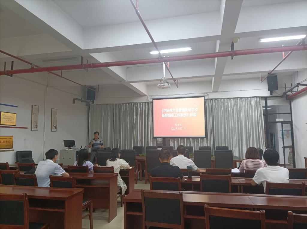 会议重点学习了中共中央印发修订后的《中国共产党普通高等学校基层组织工作条例》(以下简称《条例》)。通过学习,与会人员明确了《条例》修订的意义,特别是进一步深化对高校院(系)级单位党组织和师生党支部主要职责的认识,为下一步做好基层党组织工作以及党委换届选举奠定的基础。