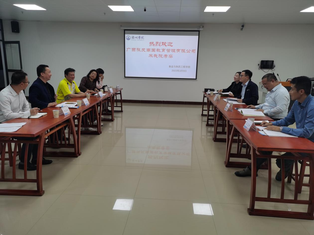 2023年3月9日下午,广西旅发南国教育管理有限公司来到我院考察,在科技楼K1512举行了校企合作交流会。梧州学院学生工作部部长李德华、食品与制药工程学院党委书记陈金辉等同志出席会议。