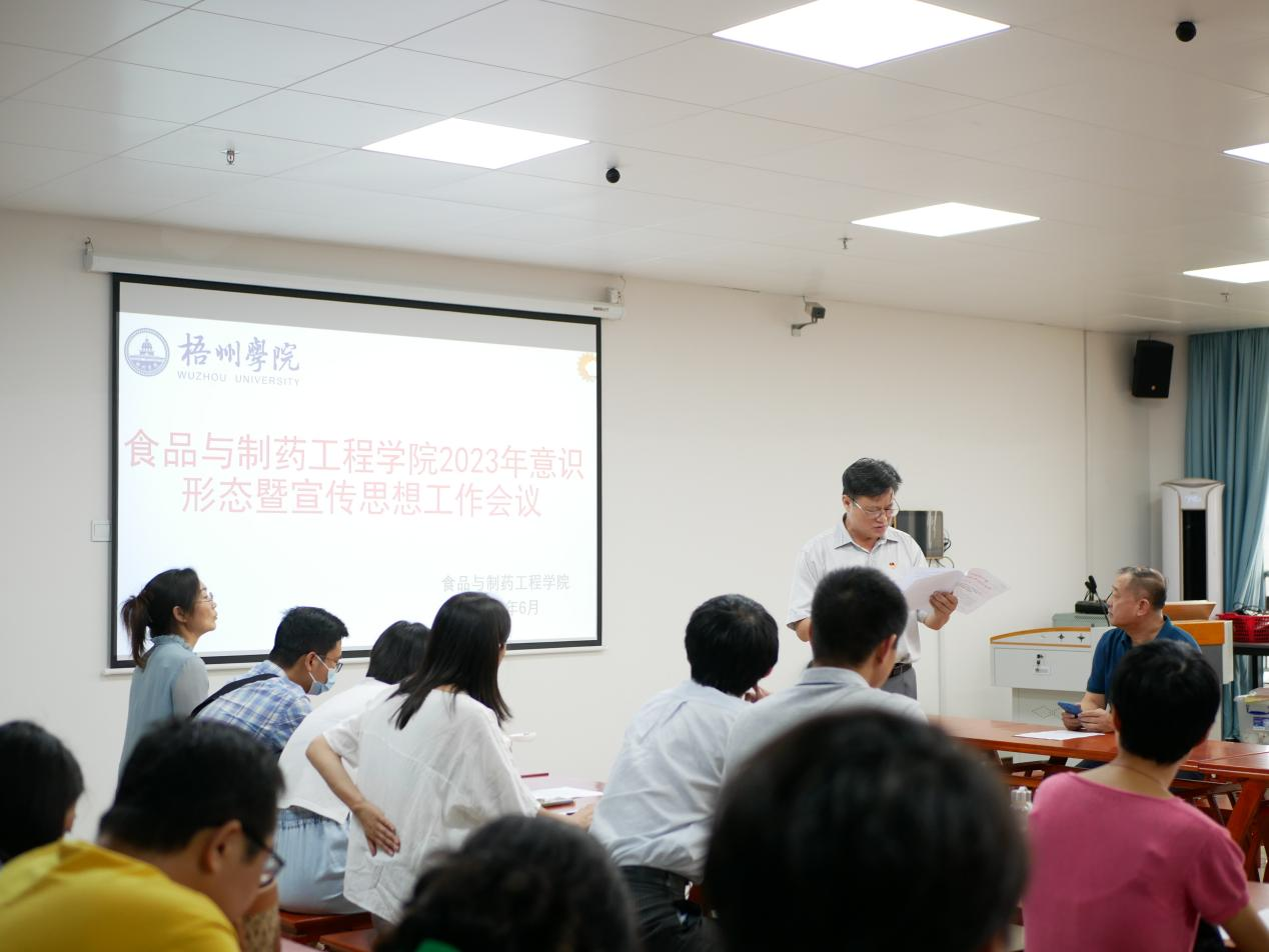 2023年6月14日14:30,食品与制药工程学院党委在明科楼K1512茶艺室召开2023年意识形态暨宣传思想工作会议,该院全体教职工参加会议,会议由党委书记陈金辉主持。