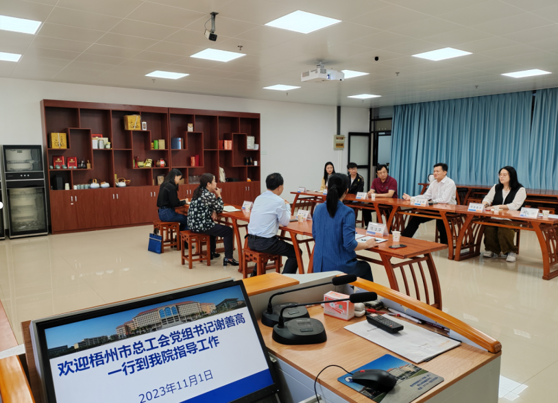 2023年11月1日上午9时,梧州市总工会党组书记谢善高书记一行四人来我院调研六堡茶现代产业学院建设情况,并共商建设广西六堡茶工匠学院事宜进。学校工会彭赞文常务副主席、食药学院陈金辉书记及茶学教研室相关教师陪同座谈。在会上,陈金辉书记介绍了食品与制药工程学院的师资力量、专业建设、科研基地建设、科研进展、社会服务等情况。与会人员也发表了一些意见建议。谢善高书记在听完相关介绍后,对我们学院所做的工作给与肯定,并建议学院整合六堡茶产业链上的相关专业资源,同总工会一起协力申报自治区级的六堡茶工匠学院,同时也对六堡茶工匠学院成立后对六堡茶产业的推动作用,以及对六堡茶产业链上的学生培养的促进作用进行了展望。彭赞文副主席、陈金辉书记表示将全力配合市总工会开展自治区级的六堡茶工匠学院申报工作。