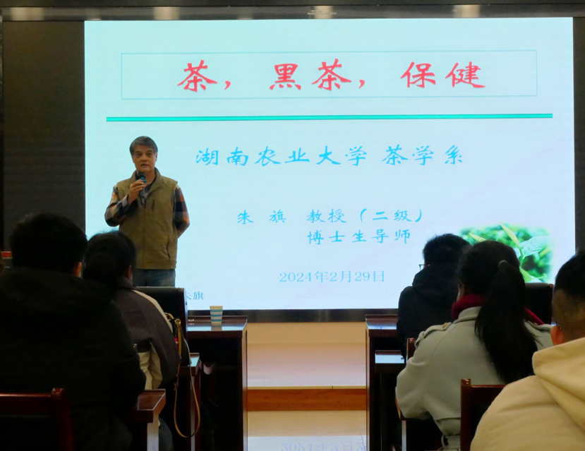 食品与制药工程学院 于2月29日晚上,诚邀茶学界的著名专家湖南农业大学二级教授、博士、博士生导师朱旗开展题为《茶,黑茶,保健》的专题讲座,由学院院长江成英主持,学院三个专业师生代表参加讲座。