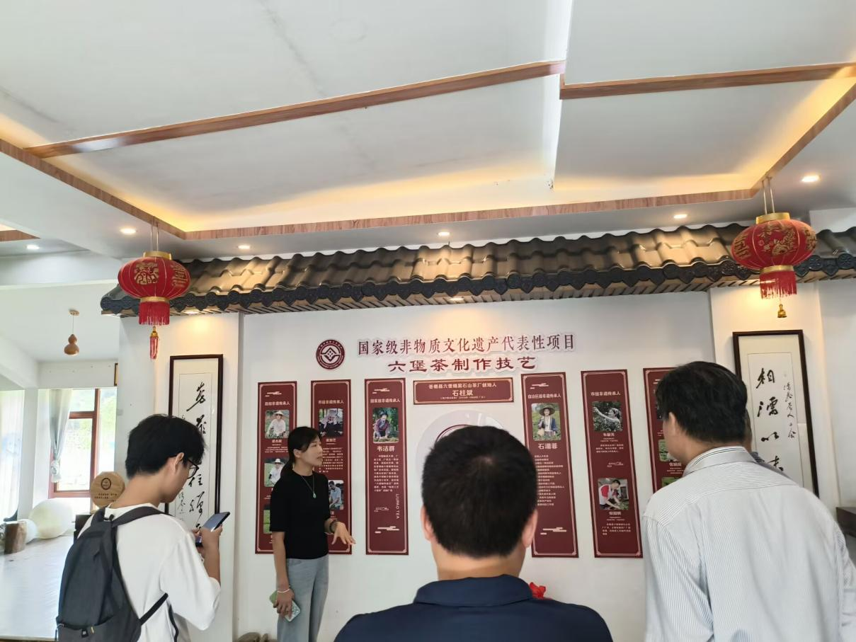 调研组首先来到苍梧县六堡镇黑石山茶厂,受到该厂党支部书记、全国人大代表、全国劳动模范、全国道德模范提名奖获得者、“六堡茶制作技艺”自治区级非遗传承人石濡菲的热情接待。调研组了解了企业在苍梧县六堡镇乡村振兴中发挥的示范引领作用。双方共同探讨了开展社会实践、课程改革、茶饮研发、学生就业等校企合作的方向。