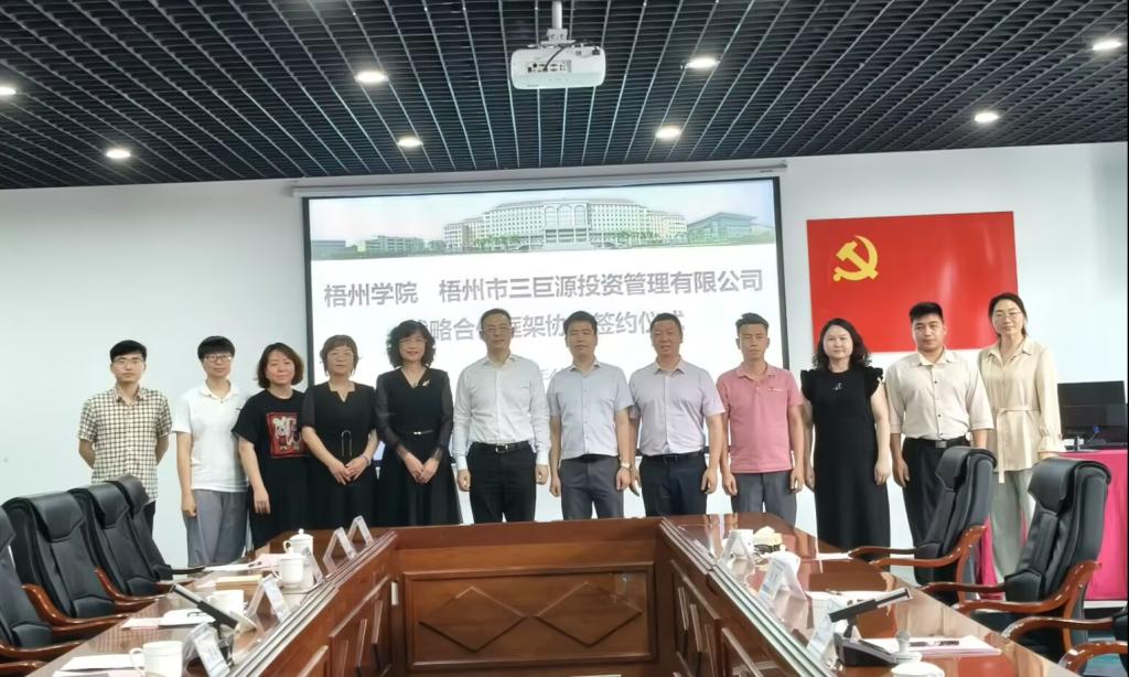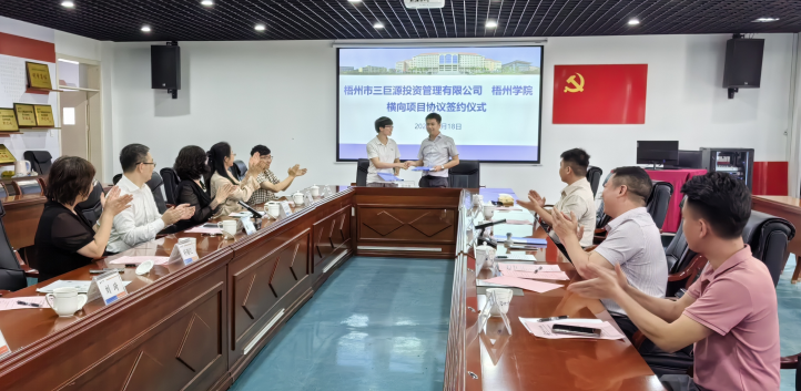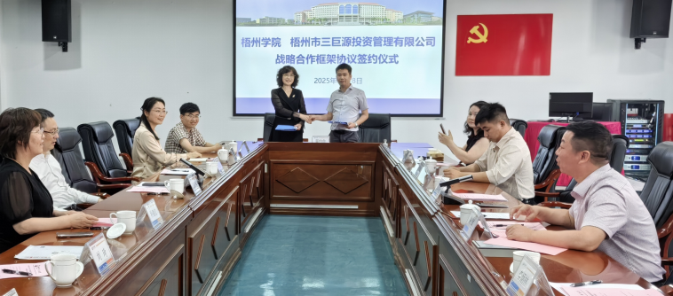 2025年4月18日下午,梧州学院与梧州市三巨源投资管理有限公司战略合作框架协议和三巨源茶园高质量建设横向项目的签约仪式在食药学院会议室圆满完成。梧州学院党委书记童晓晖、食药学院院长江成英、副院长朴春红、三巨源公司执行董事伍浩伟、总经理戴斌及相关教师和企业人员出席该仪式。