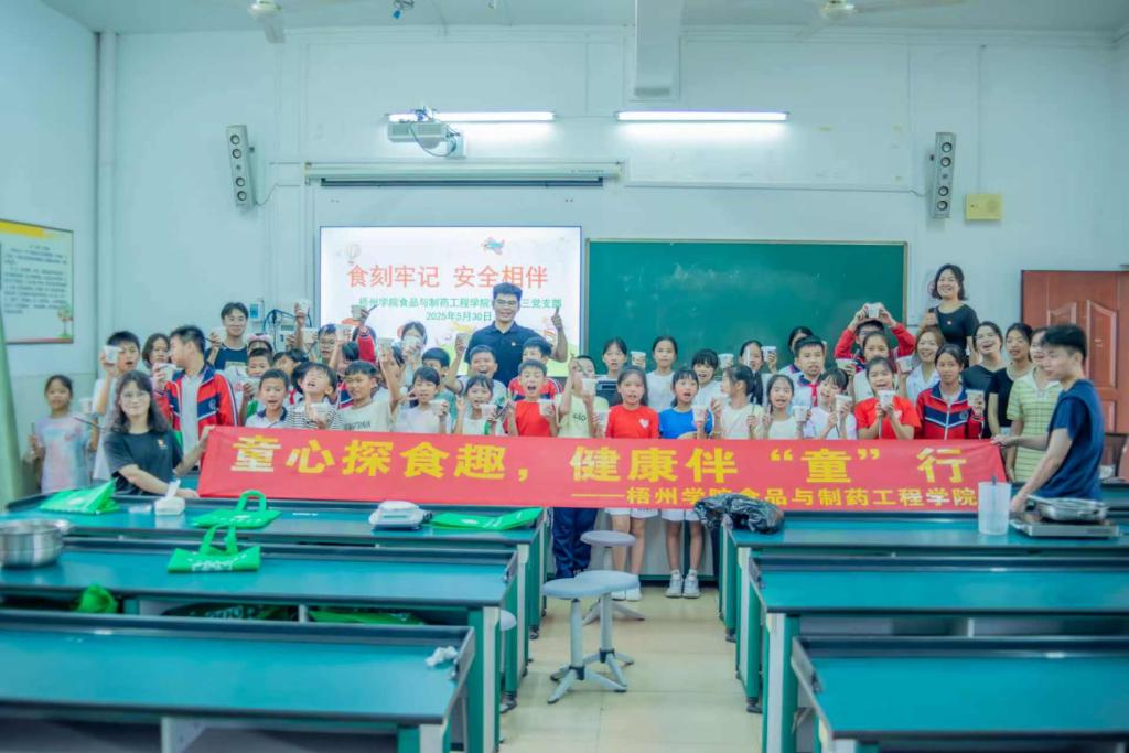 5月30日下午,在“六一”儿童节来临之际,梧州学院食品与制药工程学院学生第三党支部结合专业特色,前往梧州市莲花社区莲花小学开展“童心探食趣,健康伴‘童’行”主题科普实践活动。活动采用“理论+实践”模式,为40余名小学生带来别开生面的食品安全课。