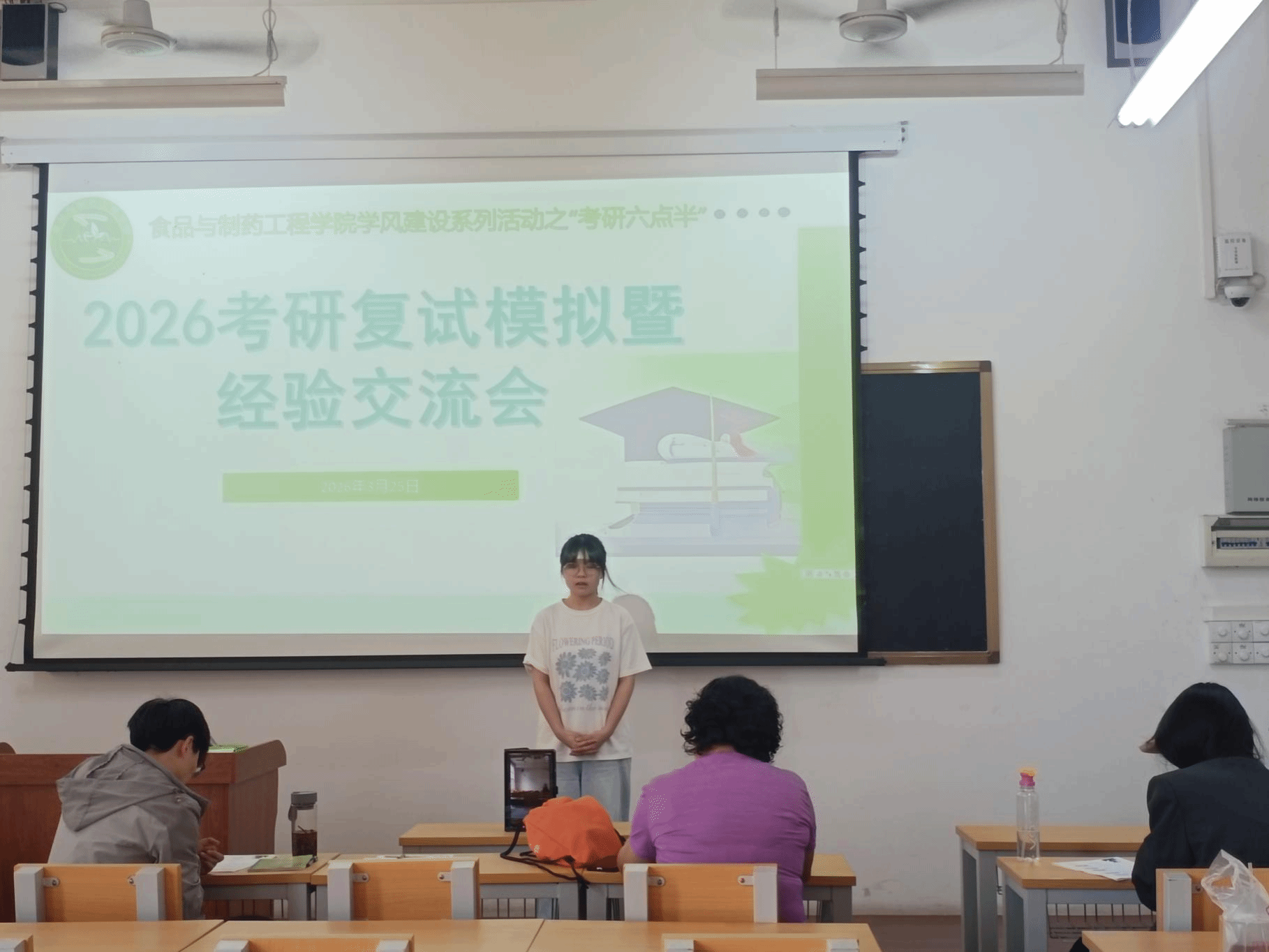 为帮助考研学子熟悉复试流程、提升应试能力,食品与制药工程学院于3月25日下午在北区教学楼S101教室举办2026年考研模拟复试暨经验交流会。学院“考研六点半”导师团董然、乔如颖、李迎名三位老师担任指导,25名进入复试的同学参与模拟面试,30余名拟考研学生到场观摩学习。