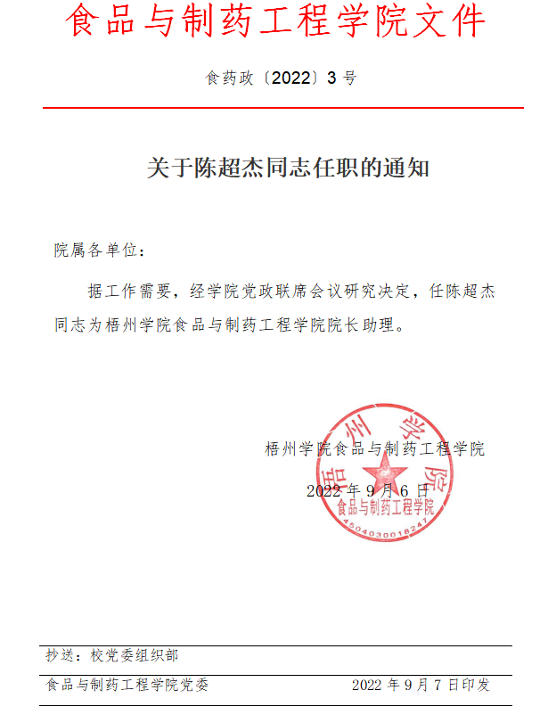 关于陈超杰同志任职的通知